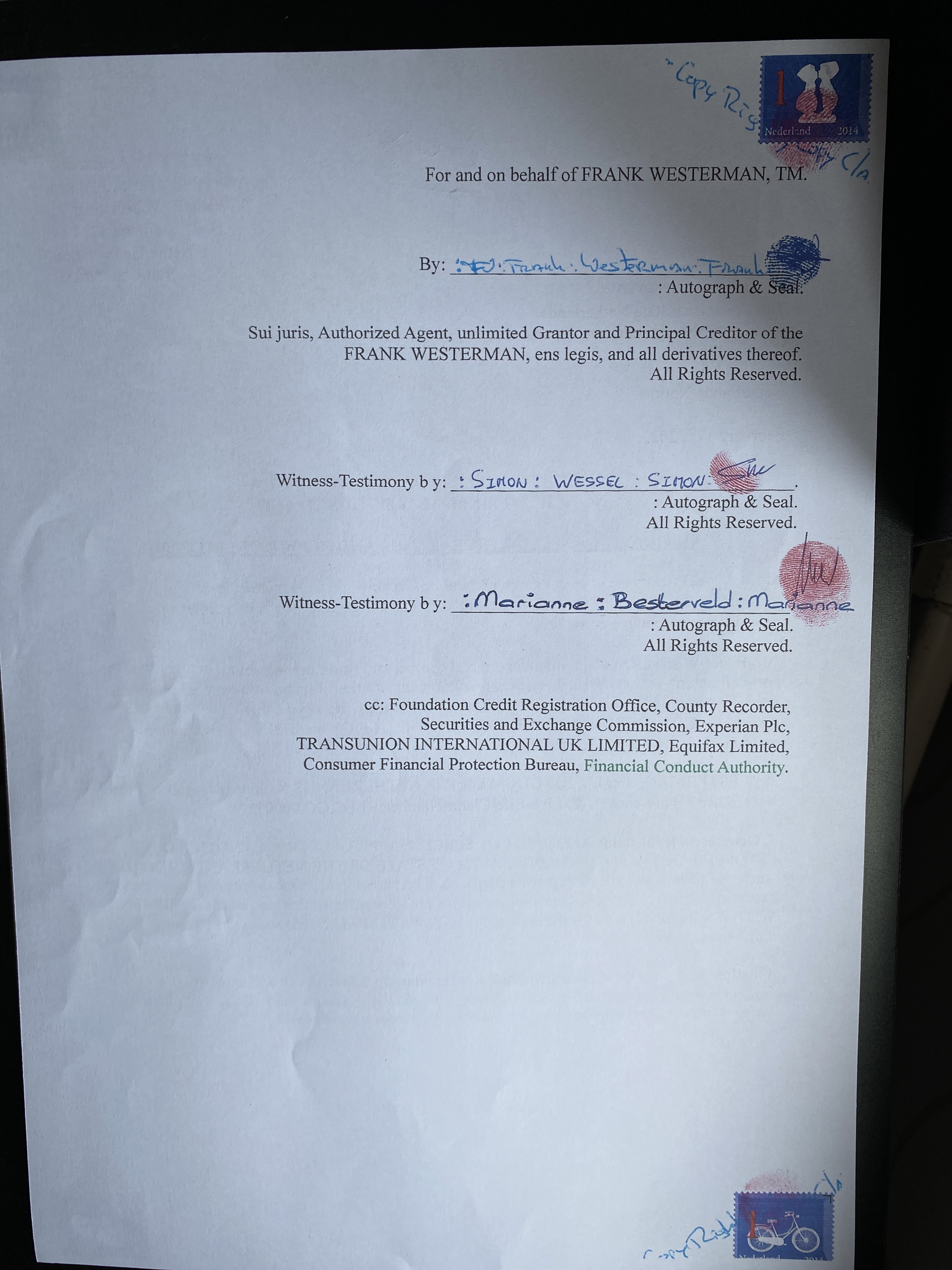 De COUNTY-CORONER-LETTER is een CLAIM waarbij je je Geboortenaam omzet in een TRADE-MARK, welke voor de EEUWIGHEID RECHTSGELDIG blijft. Tevens maakt deze CLAIM je een WETS-HANDHAVER en ADVOCAAT, je hebt volledige VOLMACHT over jezelf, daardoor haalt deze CLAIM alle VOLMACHTEN weg bij OVERHEDEN en BEDRIJVEN. Met deze CLAIM kun je het CORRUPTE RECHTSSYSTEEM AANVECHTEN, tevens kun je de NAMEN VAN JE KINDEREN CLAIMEN.